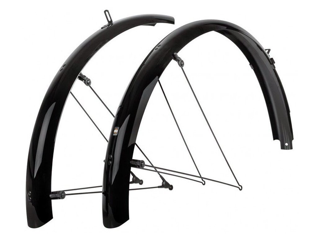 Černý set blatníků na kola 27,5" - 29" Bluemels 65 mm od SKS Germany. Přední blatník uchycení do můstku vidlice pomocí šroubu a 3mm drátů. Zadní se připevňuje ke spodní části rámu kola u šlapacího středu, a to adaptérem a 3mm dráty.Barva: černá