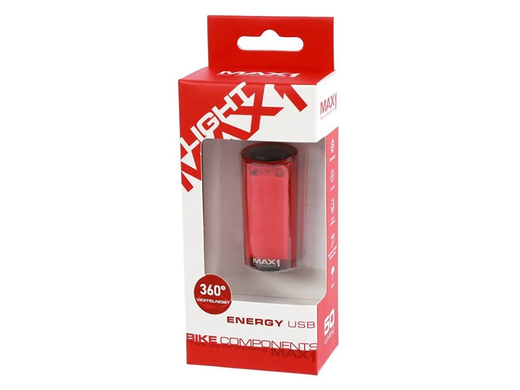 Zadní blikačka MAX1 Energy USB.Díky univerzálnímu uchycení v kombinaci se specifickým držákem pro jízdní kolo lze blikačku připevnit třeba i na batoh či běžecký pásek. Světlo lze během provozu dobíjet powerbankou.