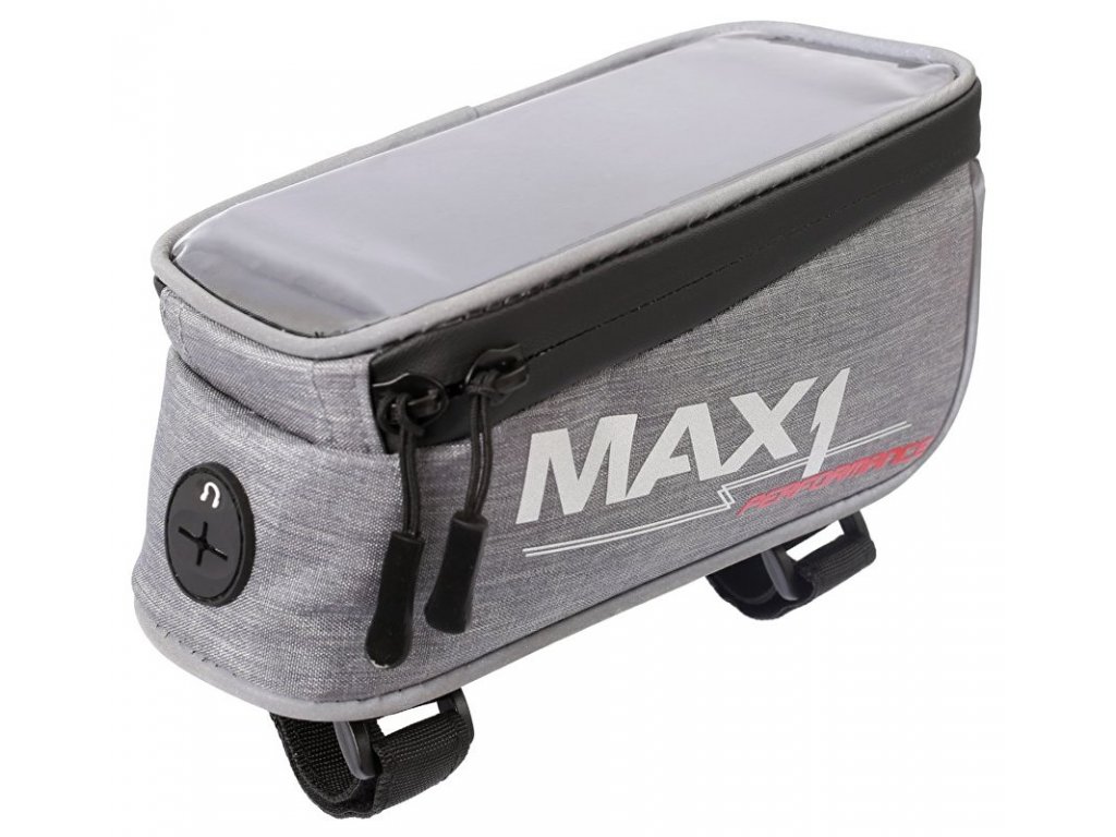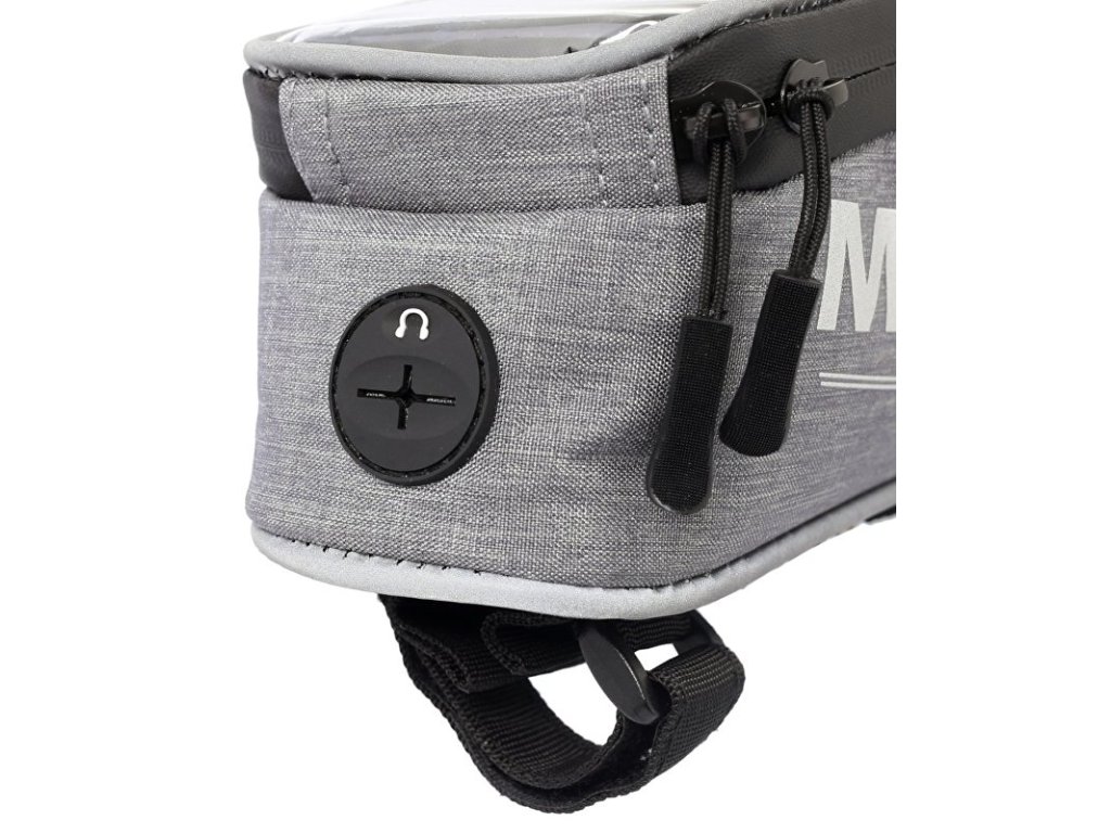 Kompaktní brašna MAX1 na rámovou trubku s kapsou uzpůsobenou pro mobilní telefon.Gumová membrána pro umístění sluchátek ve spodní části brašny. Pasuje na většinu standardních rámů.