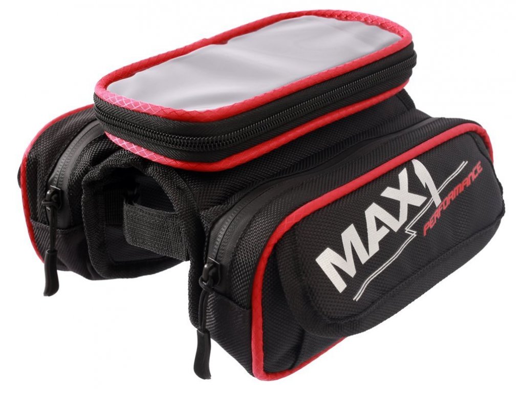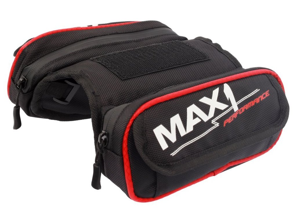 Kompaktní dvojitá brašna MAX1 na rámovou trubku s odnímatelnou kapsou uzpůsobenou pro mobilní telefon.Gumová membrána pro umístění sluchátek ve spodní části brašny.