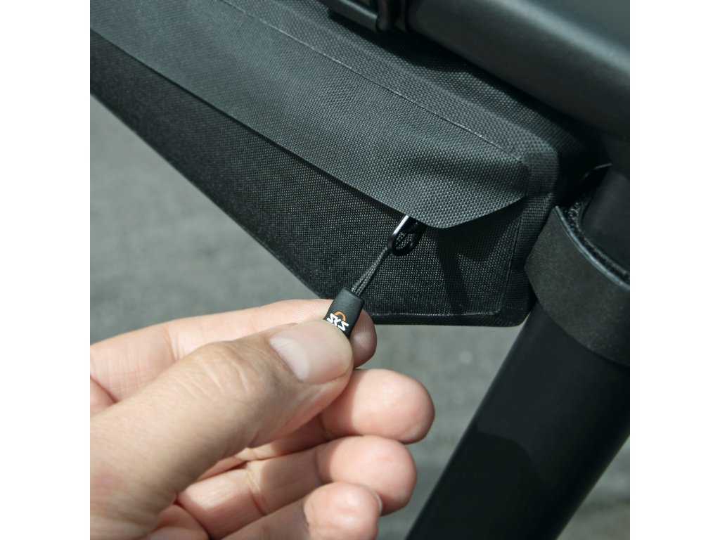 Do rámového trojúhelníku se díky úzkému designu brašny SKS snadno vejde i láhve na pití.