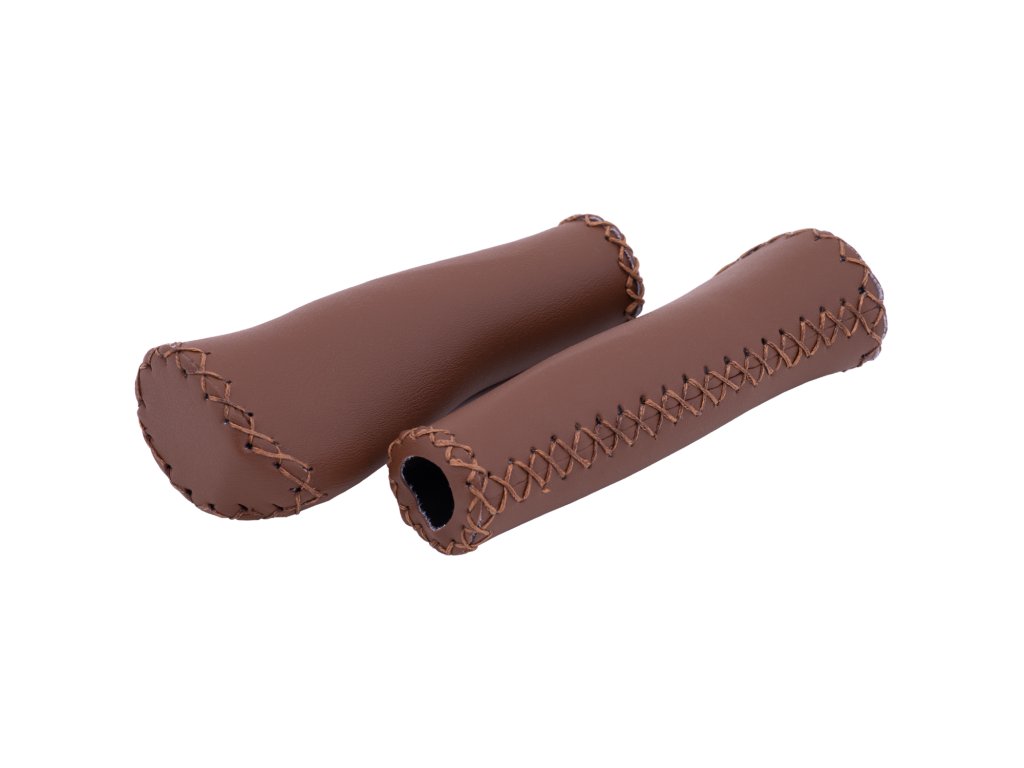 Anatomicky tvarované plastové gripy obalené hnědou koženkou; Barva: hnědá; Rozměr: 130x22 mm; OEM