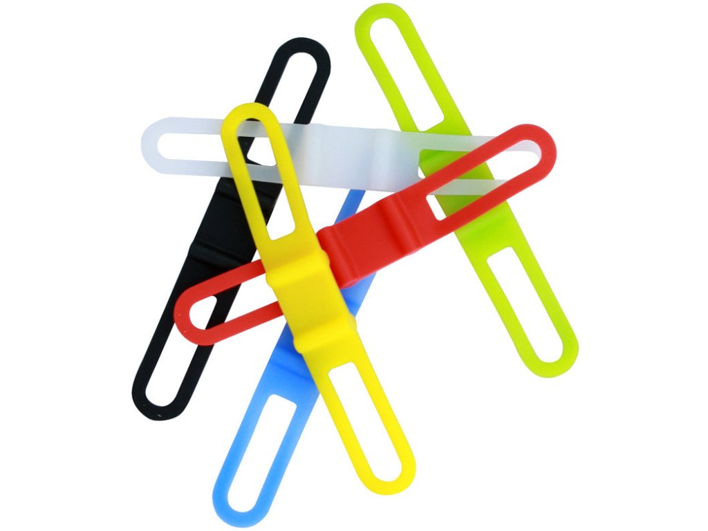 Pomůcka pro snadné připevnění jakéhokoliv světla na řídítka, sedlovku, přilbu, kočárek, opasek atd., lze připevnit i mobilní telefon na řidítka atd.Balení pro prodejny po 10ks (1xbílý, 1xčervený, 5xčerné, 1x modrý, 1xžlutý, 1xzelený)