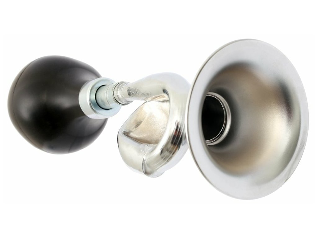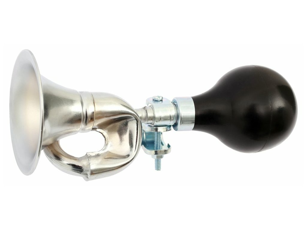 Kovová houkačka pro montáž na řidítka. Model poštovní trumpeta.Součástí uchýt na klasická řidítka o 22,2 mm.