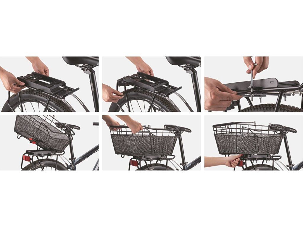 Rychloupínací adaptér Flexi-Max umožní snadné nasazení/sejmutí koše z nosiče jízdního kola pomocí rychloupínacího tlačítka. Koš s úzkými oky ve spodní části zabraňuje propadnutí menších předmětů.