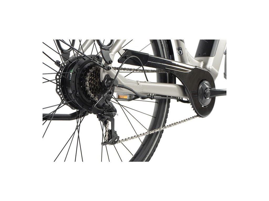 Zadní elektromotor Bafang vyniká velmi plynulým a tichým chodem. Nabízí nominální výkon 250 W, max. výkon 350 W a plně dostačující kroutící moment pro jízdu ve městě 45 Nm.