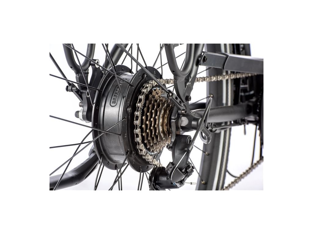 Zadní elektromotor Bafang vyniká velmi plynulým a tichým chodem. Nabízí nominální výkon 250 W, max. výkon 350 W a plně dostačující kroutící moment pro jízdu ve městě 45 Nm.