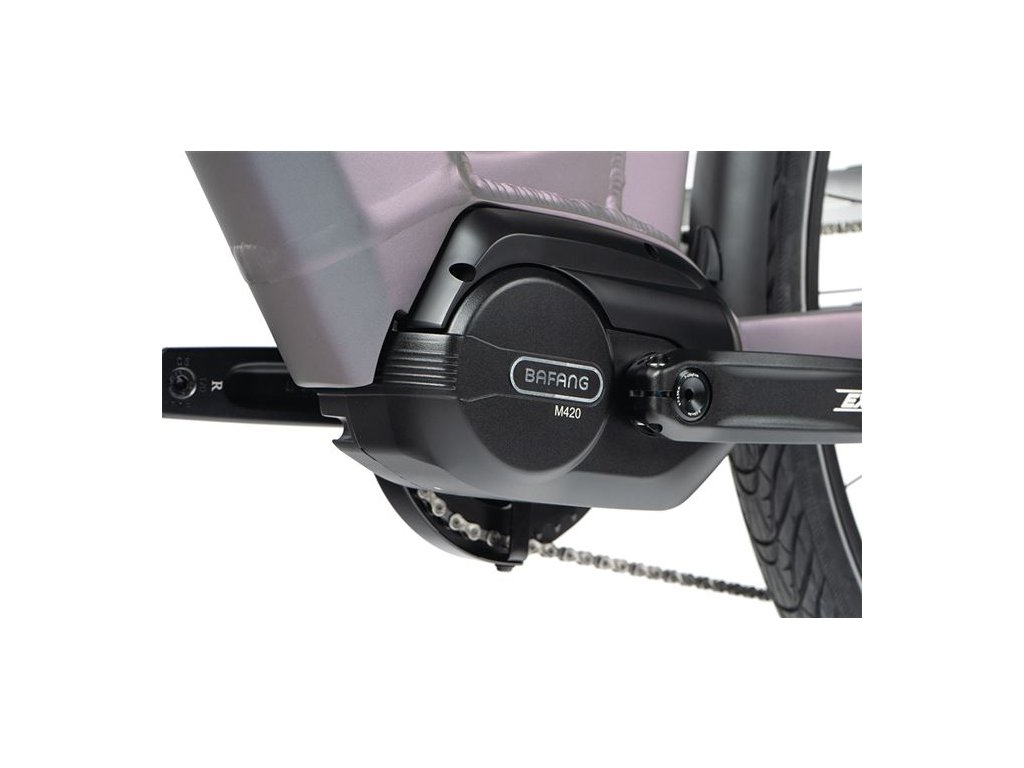 Elektromotor Bafang M420 vyniká velmi plynulým a tichým chodem a nadprůměrným výkonem. Nabízí nominální výkon 250 W, max. výkon 550 W a vysoký kroutící moment až 80 Nm. Je vybaven torzním snímačem síly šlapání. To znamená, že čím větší silou cyklista šlape, tím větší silou mu motor pomáhá. K motoru lze namontovat snímač řazení (Gear senzor), který vám umožní snadno a rychle měnit rychlosti za všech okolností.