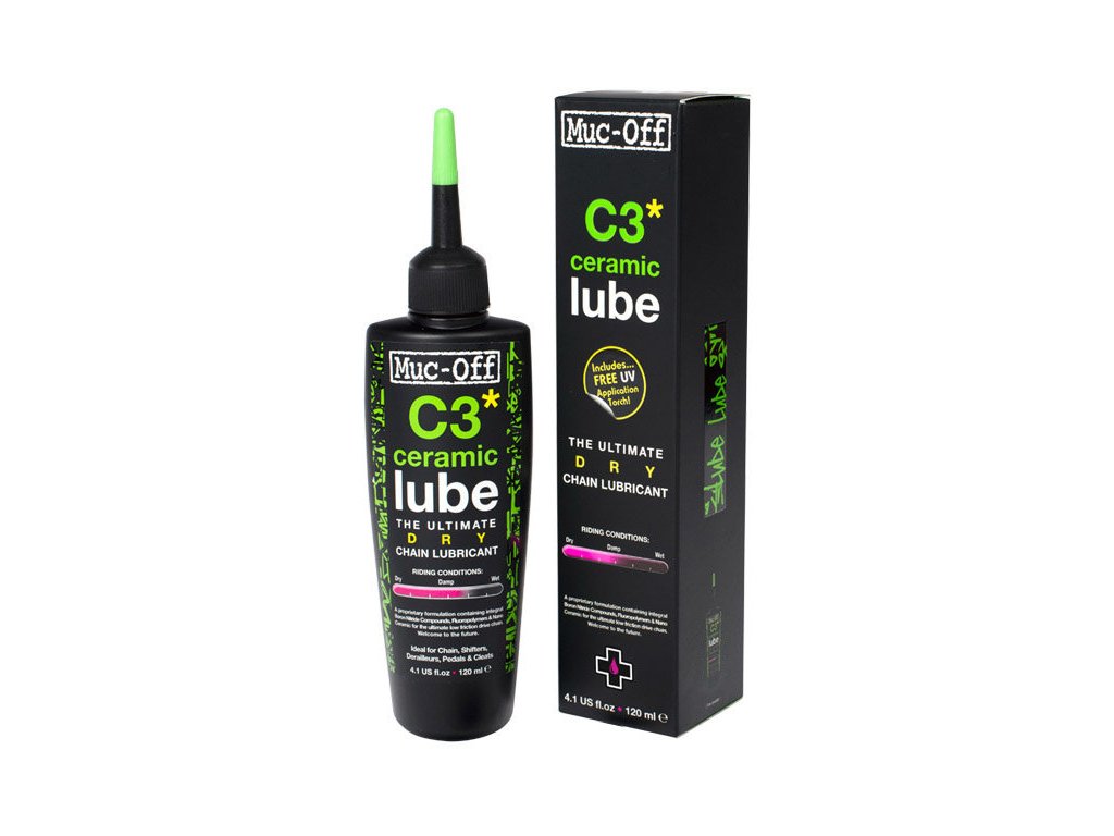 Muc Off C3 Ceramic Lube Dry 120ml- patentované složení založené na sloučenině nitridu boru, fluoropolymerech a nano keramických aditivech zajišťujících velmi nízkou frikci