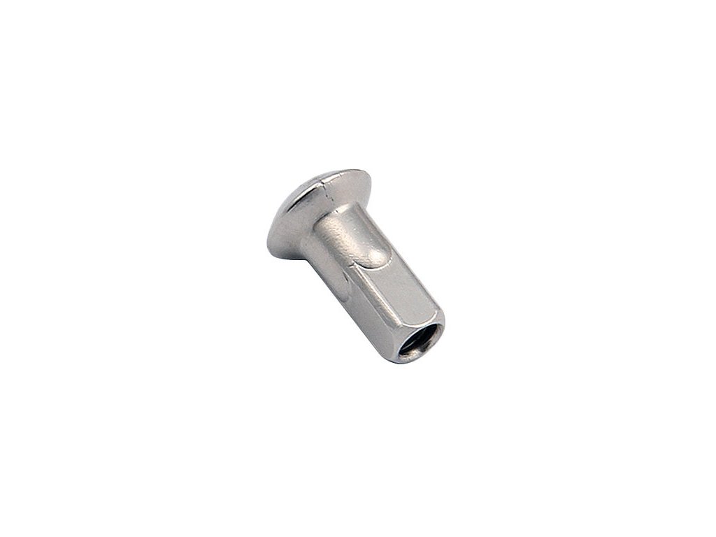 kvalitní a osvědčený nipl MACH1 pro dílenské použití na výplety dvoustěnných ráfků a výplety elektro kol, niklovaný závit 2,6 mm, po 50 ks