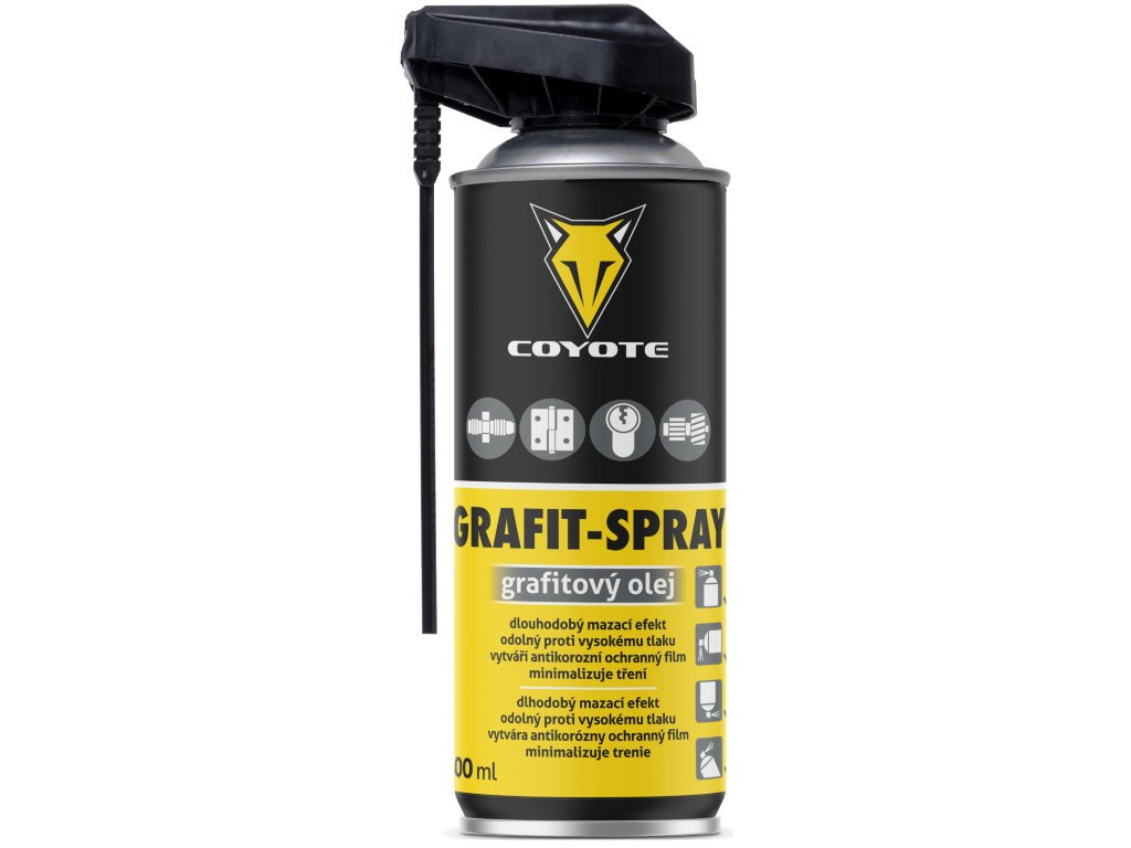 Coyote Grafit - Spray 400 ml vytváří ochranný film, který zajišťuje dlouhodobý mazací efekt.Použití: panty; závěsy; kolejnice; hřídele; zámky; navijáky; šrouby; matice; kulové čepy; listových per a dalších.