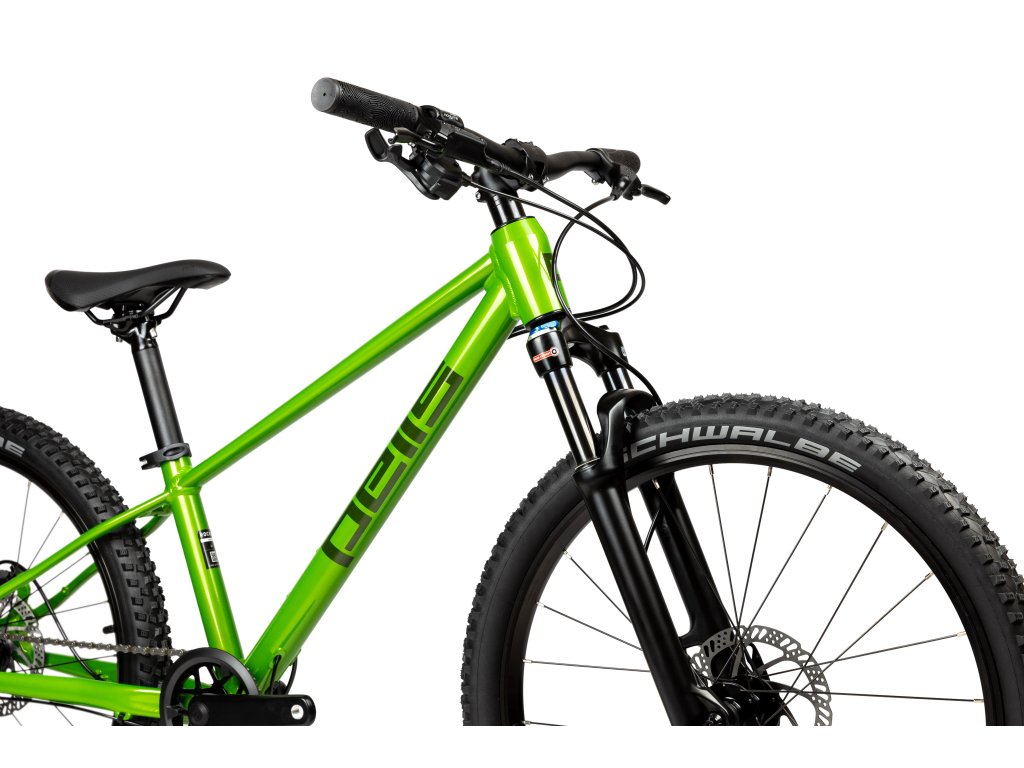 Rocket Air je dětské kolo s 24“ koly vybaveno vzduchovou vidlicí SUNTOUR XCR Air se zdvihem 80 mm a zajímavým řazením MICROSHIFT Acolyte 1x8s, které je na přehazovačce vybaveno brzdou, což zamezuje bouchání a padaní řetězu při jízdě náročnějším terénem. Na pozici brzd najdete hydraulické TEKTRO v juniorském provedení. Osazené pláště jsou SCHWALBE Rocket Ron o šíři 2,1“ s kevlarovou skládací patkou pro dosažení nízké hmotnosti.