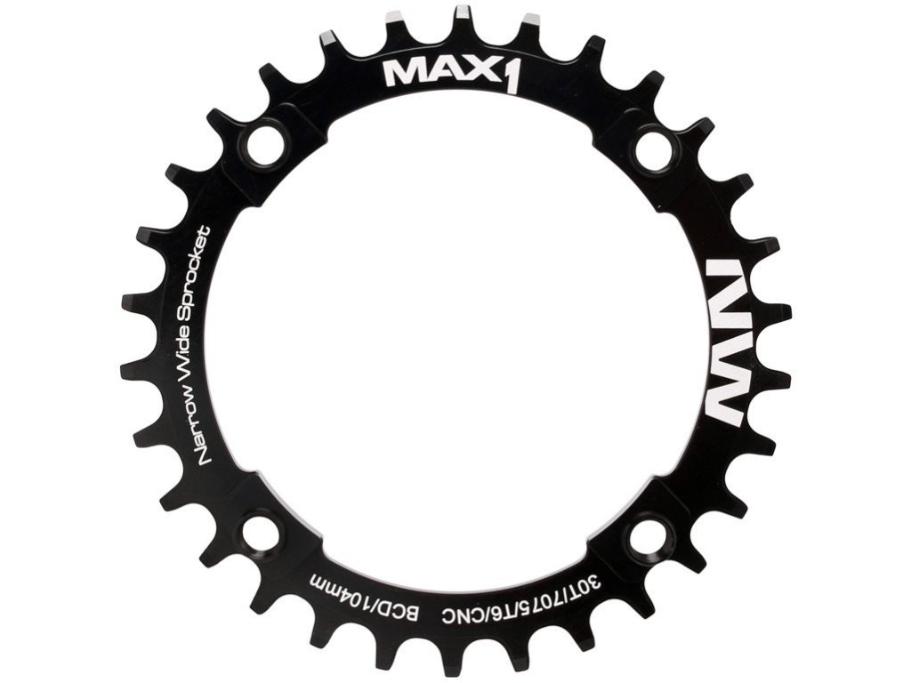 Převodník MAX1 Narrow Wide pro montáž na kliky s roztečí 104mm.Tvar zubů zajišťuje hladký chod a stabilitu řetězu s převody 1x10 nebo 1x11, převodník je tedy možné použít jak na 10-ti, ale i 11-ti rychlostní řazení.