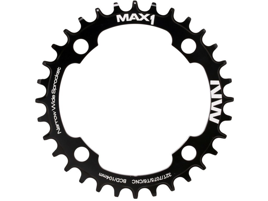 Převodník MAX1 Narrow Wide pro montáž na kliky s roztečí 104mm.Tvar zubů zajišťuje hladký chod a stabilitu řetězu s převody 1x10 nebo 1x11, převodník je tedy možné použít jak na 10-ti, ale i 11-ti rychlostní řazení.