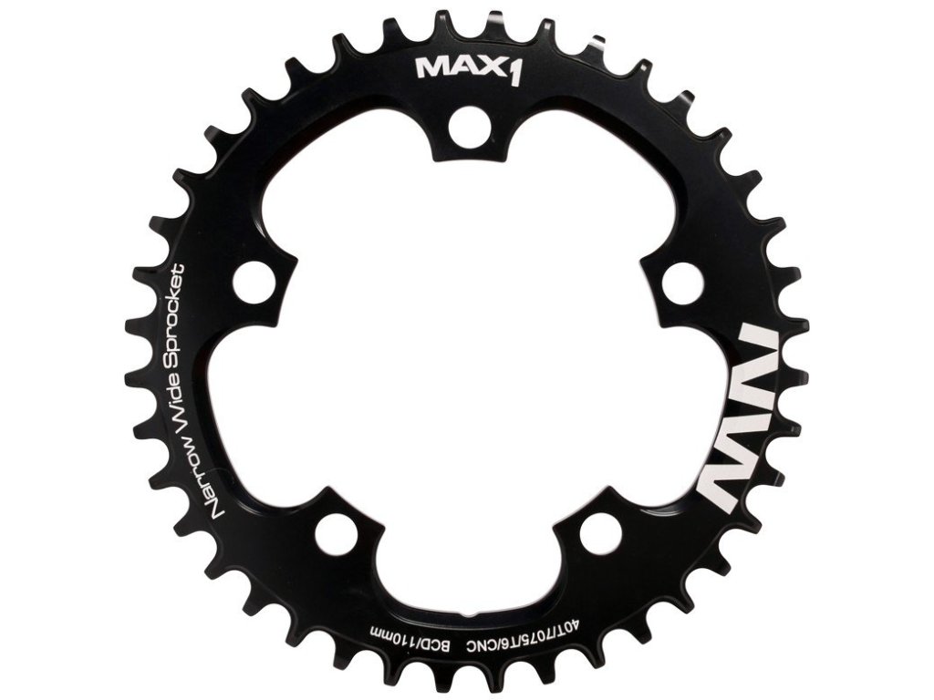 Převodník MAX1 Narrow Wide pro montáž na kliky s roztečí 110 mm.Tvar zubů zajišťuje hladký chod a stabilitu řetězu s převody 1x9, 1x10, 1x11 nebo 1x12, převodník je tedy možné použít na 9 - 12-ti rychlostní řazení.