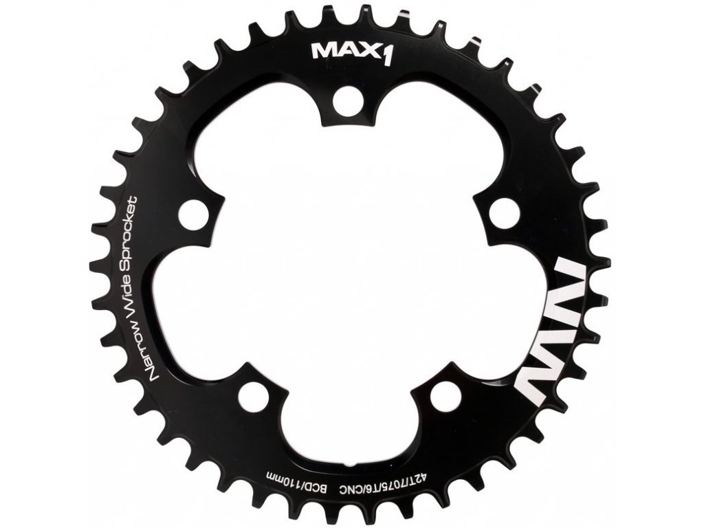 Převodník MAX1 Narrow Wide pro montáž na kliky s roztečí 110 mm.Tvar zubů zajišťuje hladký chod a stabilitu řetězu s převody 1x9, 1x10, 1x11 nebo 1x12, převodník je tedy možné použít na 9 - 12-ti rychlostní řazení.