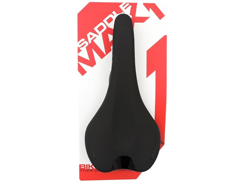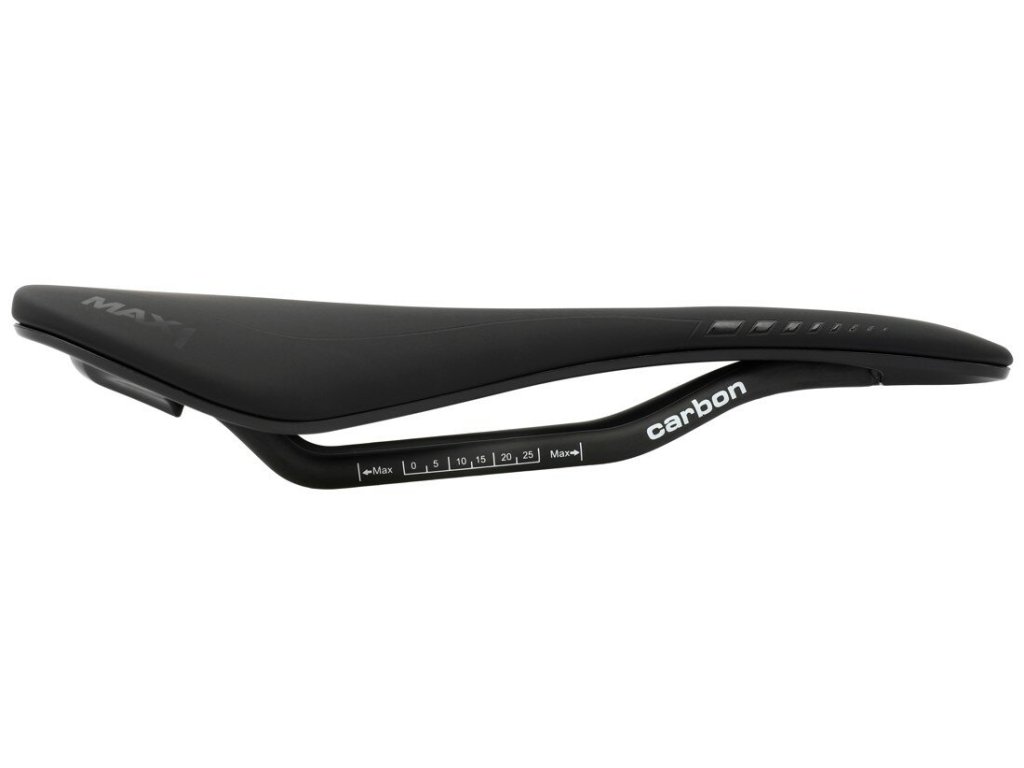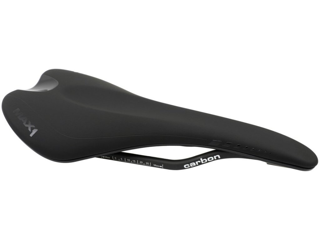 Závodní sedlo MAX1 Evo s karbnovými ližinami a karbonovou platformou.Ergonomický středový prolis zvyšuje komfort a redukuje tlak v pánevní oblasti. Výplň sedla velmi dobře tlumí otřesy a zajišťuje pohodlí. Jednoduchá údržba a voděodolný povrch.